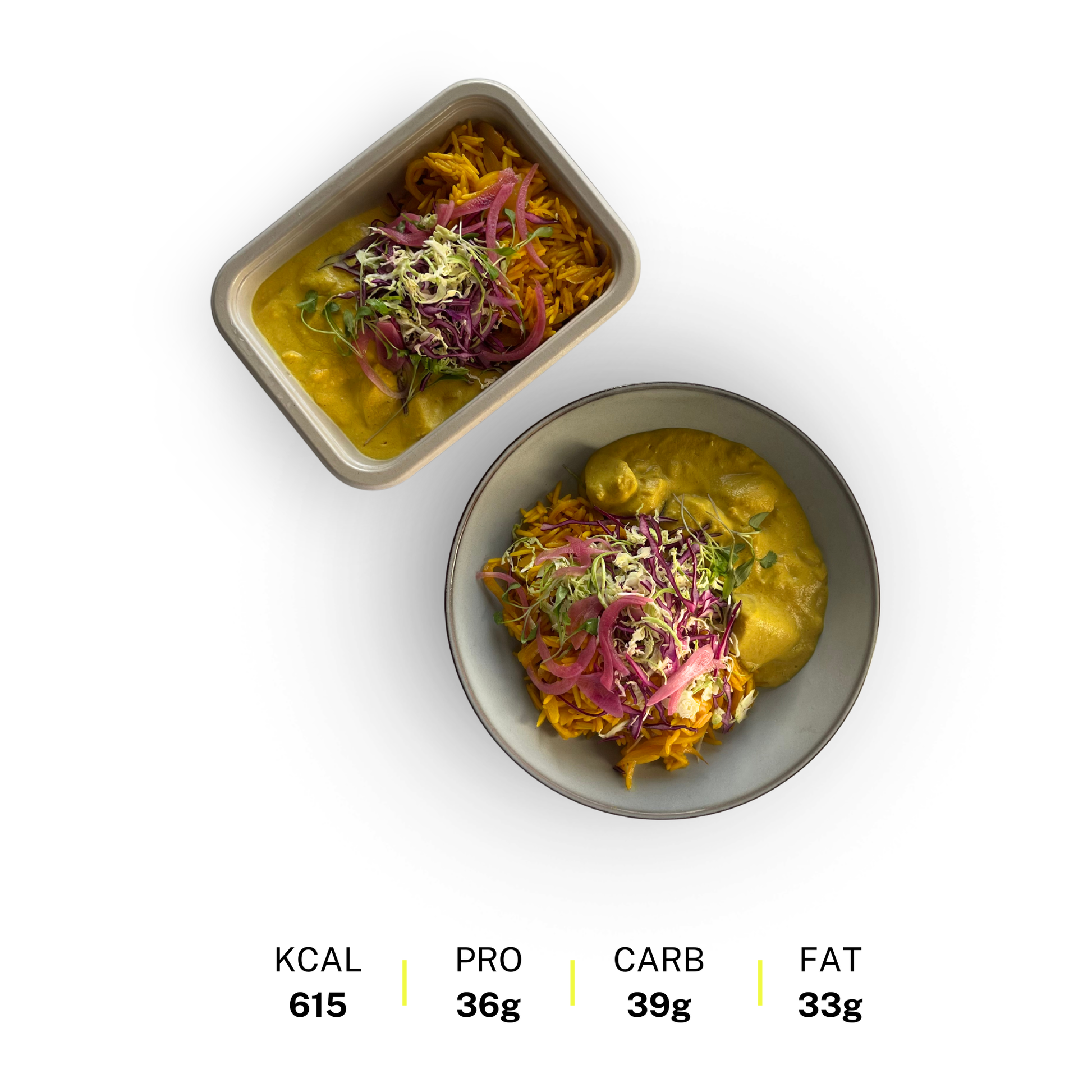Creamy satay chicken curry served with fluffy pilau rice, sharp pickled red onions, crunchy red cabbage and fresh spring onions – a rich, high-protein dish with the perfect balance of nutty, tangy and aromatic flavours.